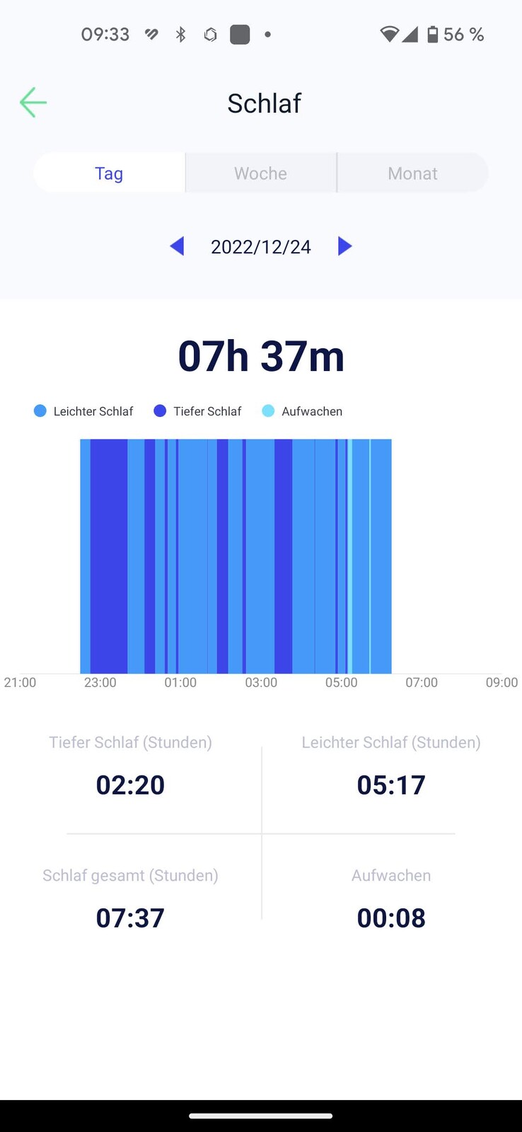Il rilevamento del sonno del DT8 Ultra è molto rudimentale. Il software visualizza il tempo totale di sonno, nonché i valori delle fasi di sonno leggero, sonno profondo e veglia. Tuttavia, i valori registrati devono essere trattati con cautela. A volte l'orologio ha visualizzato tempi molto più brevi nel test, ad esempio solo quattro ore di sonno, anche se il tester ha dormito per quasi otto ore. Il DT8 Ultra non riconosce affatto i sonnellini e manca anche una sveglia intelligente.