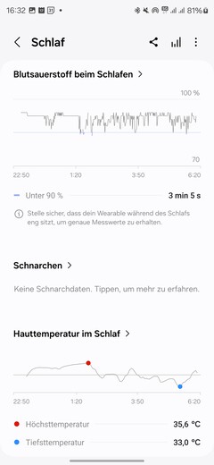 Viene valutata anche la qualità del sonno. Samsung fornisce un valore del sonno - un numero compreso tra 0 e 100, che è anche suddiviso in quattro categorie. Il valore del sonno viene anche confrontato con altre persone della stessa fascia d'età. Il punteggio complessivo del sonno dipende da vari fattori, che vengono suddivisi individualmente: Tempo di sonno, recupero fisico, riposo e rilassamento, recupero mentale e cicli del sonno.