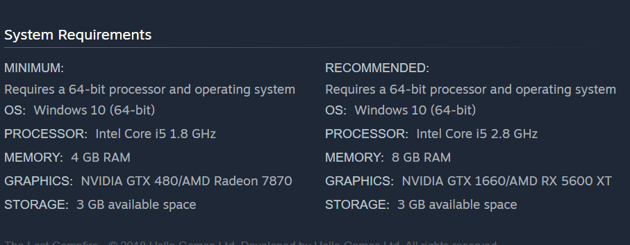 Esaminando alcuni requisiti hardware specifici, The Last Campfire raccomanda: