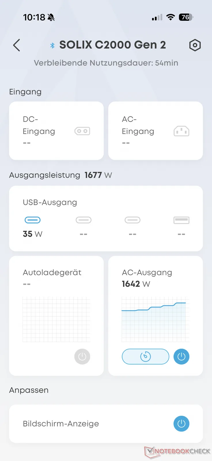 Con i suoi 2.400 W (picco di 4.000 W), la C2000 Gen 2 ha alimentato in modo affidabile un gran numero di dispositivi durante il test. Un altro aspetto positivo è che la centrale elettrica è diventata significativamente più economica quando è inattiva. Se si dimentica di spegnere l'intero dispositivo o le porte CA, si perde meno energia.