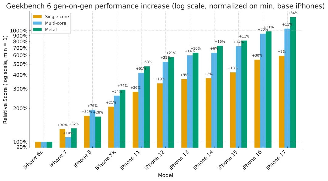 Dal lancio dell'iPhone 6S nel 2015 e del suo Apple SoC A9il punteggio Geekbench 6 single-core dell'iPhone 17 di base è migliorato di ben il 588%. Gli aumenti delle prestazioni multi-core e grafiche sono ancora più impressionanti, rispettivamente del 1.000% e del 1.250%. Queste percentuali sono state calcolate utilizzando i numeri di dal database di Geekbench 6 e normalizzati rispetto al punteggio dell'A19 al 100%.