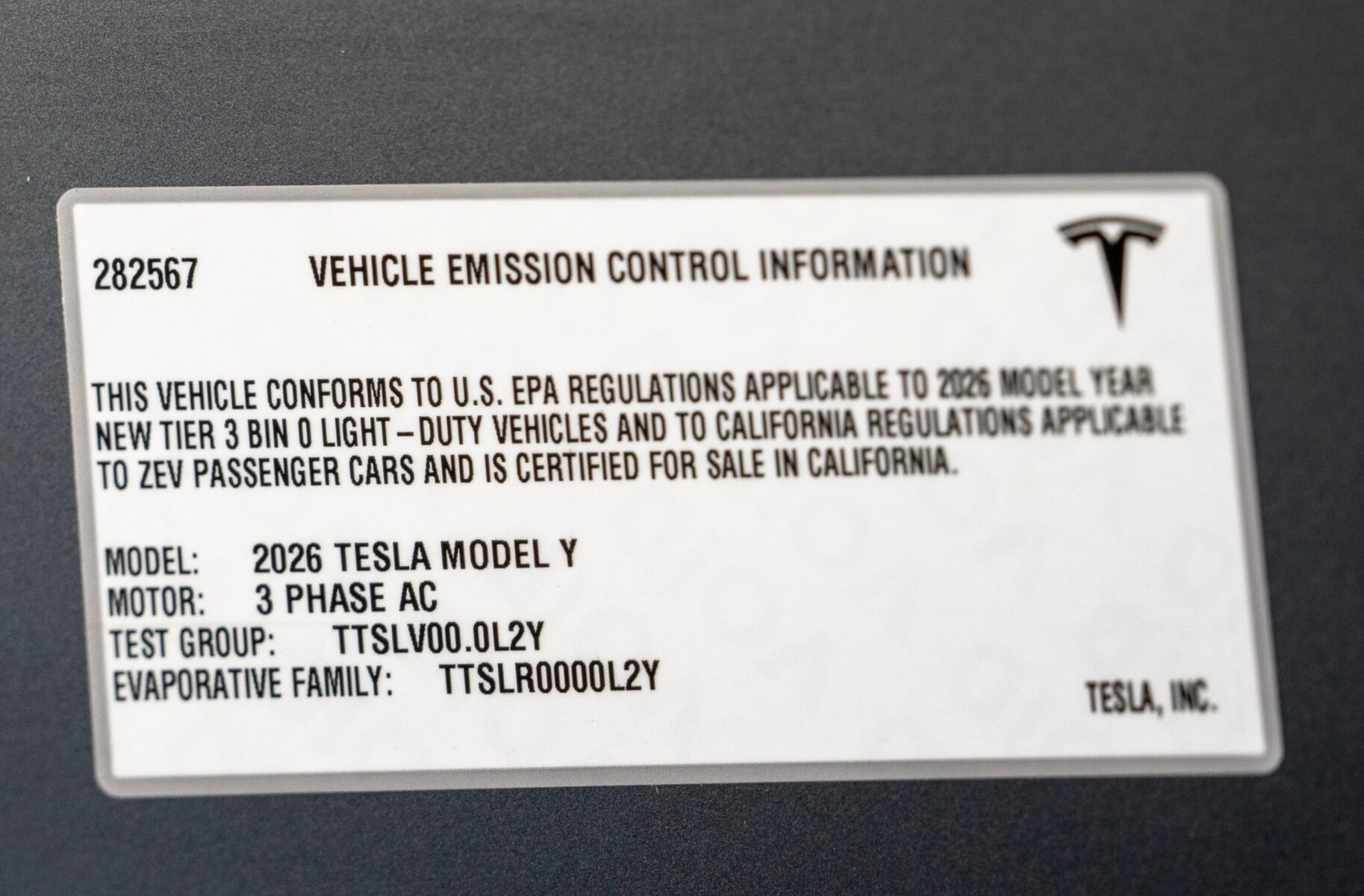 È emersa una foto del cartello di conformità alle emissioni in California della nuova Model Y, in cui Tesla si riferisce al facelift come alla Model Y del 2026. Nella maggior parte delle indiscrezioni e delle speculazioni precedenti al suo annuncio, o anche fino ad ora, il veicolo è stato indicato come la Model Y del 2025 2025 Modello Y. Dopo tutto, è stata presentata solo a gennaio, con una data di uscita fissata per la primavera.