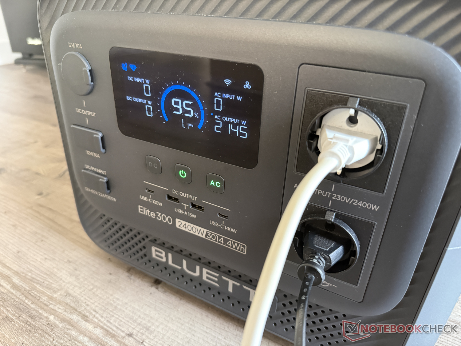La potenza di uscita CA è di 2.400 W a 230 V, che può essere aumentata fino a 4.800 W per brevi periodi. Oltre alle due prese CA, ci sono quattro porte USB (due USB-A con 15 W, una USB-C con 100 W e una USB-C con 140 W), una presa auto da 12 V (presa accendisigari) con un massimo di 120 W e una connessione CC con 12 V e 30 A nella parte anteriore.