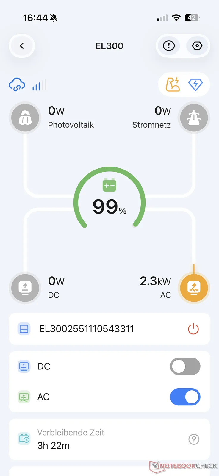 La connessione ha funzionato senza problemi durante il test. La panoramica non mostra solo i valori di potenza attuale durante la carica e la scarica. Le porte AC e DC possono anche essere attivate e disattivate. L'app mostra anche la durata residua della batteria per la carica attuale.