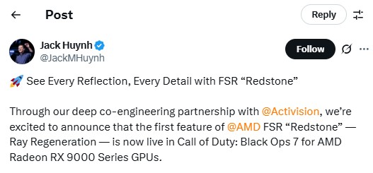 Separatamente, il dirigente di AMD Jack Huynh ha postato su X che la Rigenerazione del raggio FSR 'Redstone' è ora disponibile in Call of Duty: Black Ops 7 per le GPU AMD Radeon RX 9000 Series, promettendo che ne arriveranno altre.