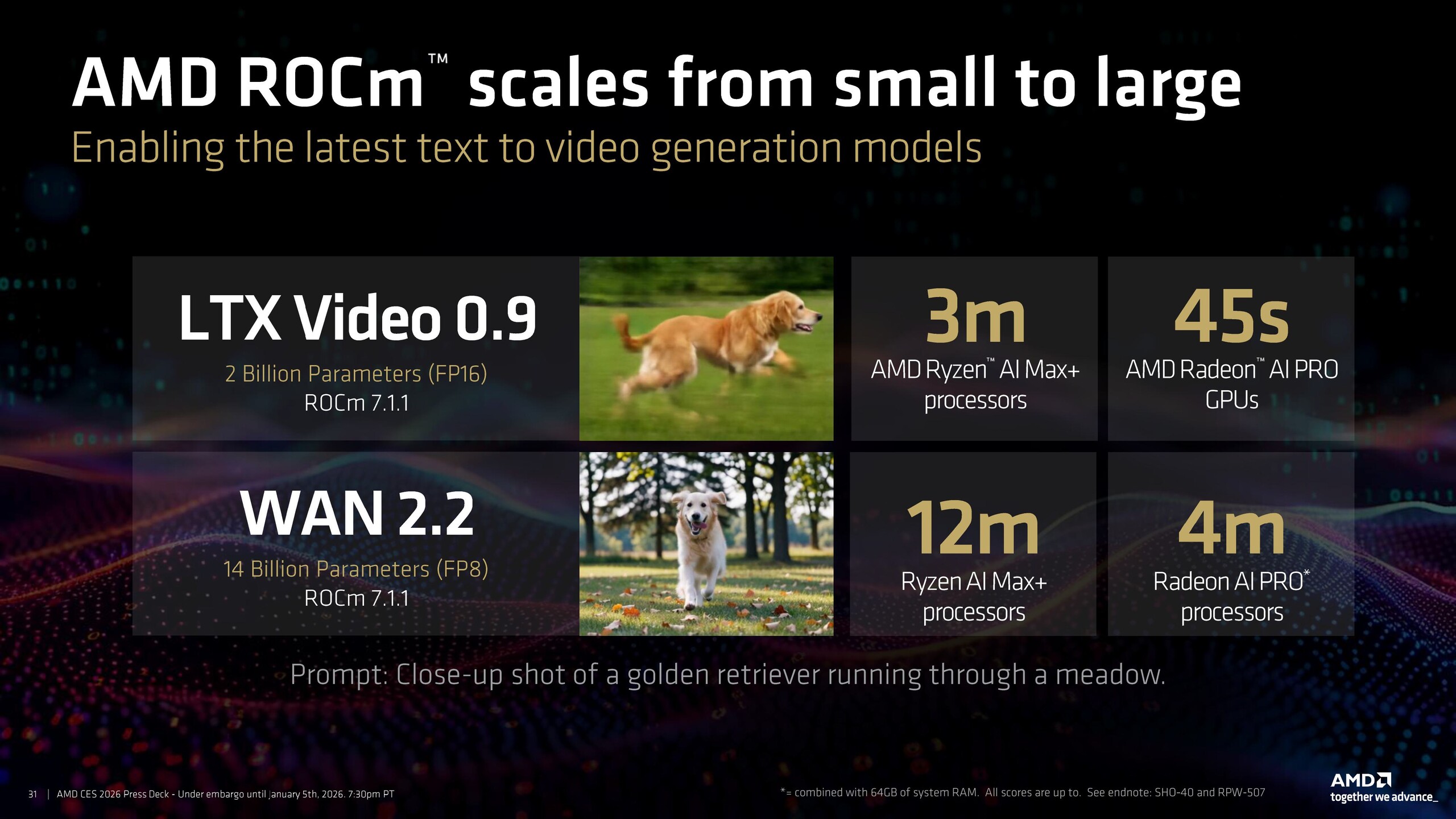 ROCm 7.1 ha anche dimostrato prestazioni impressionanti nei modelli di generazione da testo a video come LTX Video 0.9 e Wan 2.2, completando il requisito del prompt in soli 3 minuti su Ryzen AI Max+ Ryzen AI Max+ E in 45 secondi sulle GPU Radeon AI Pro.