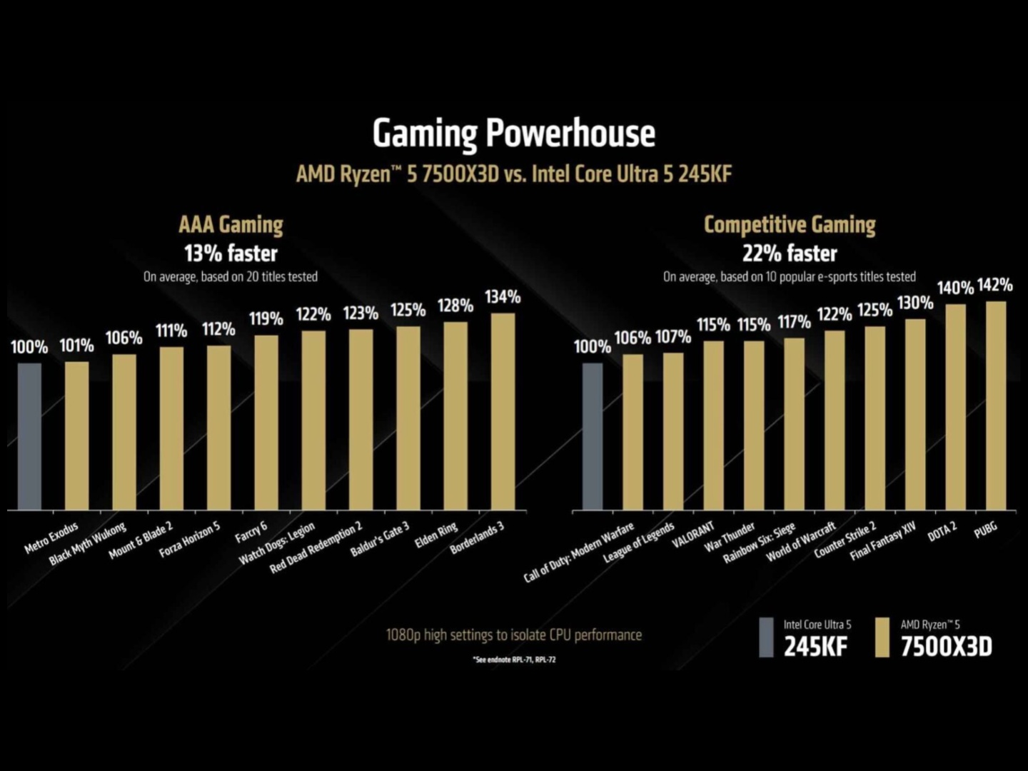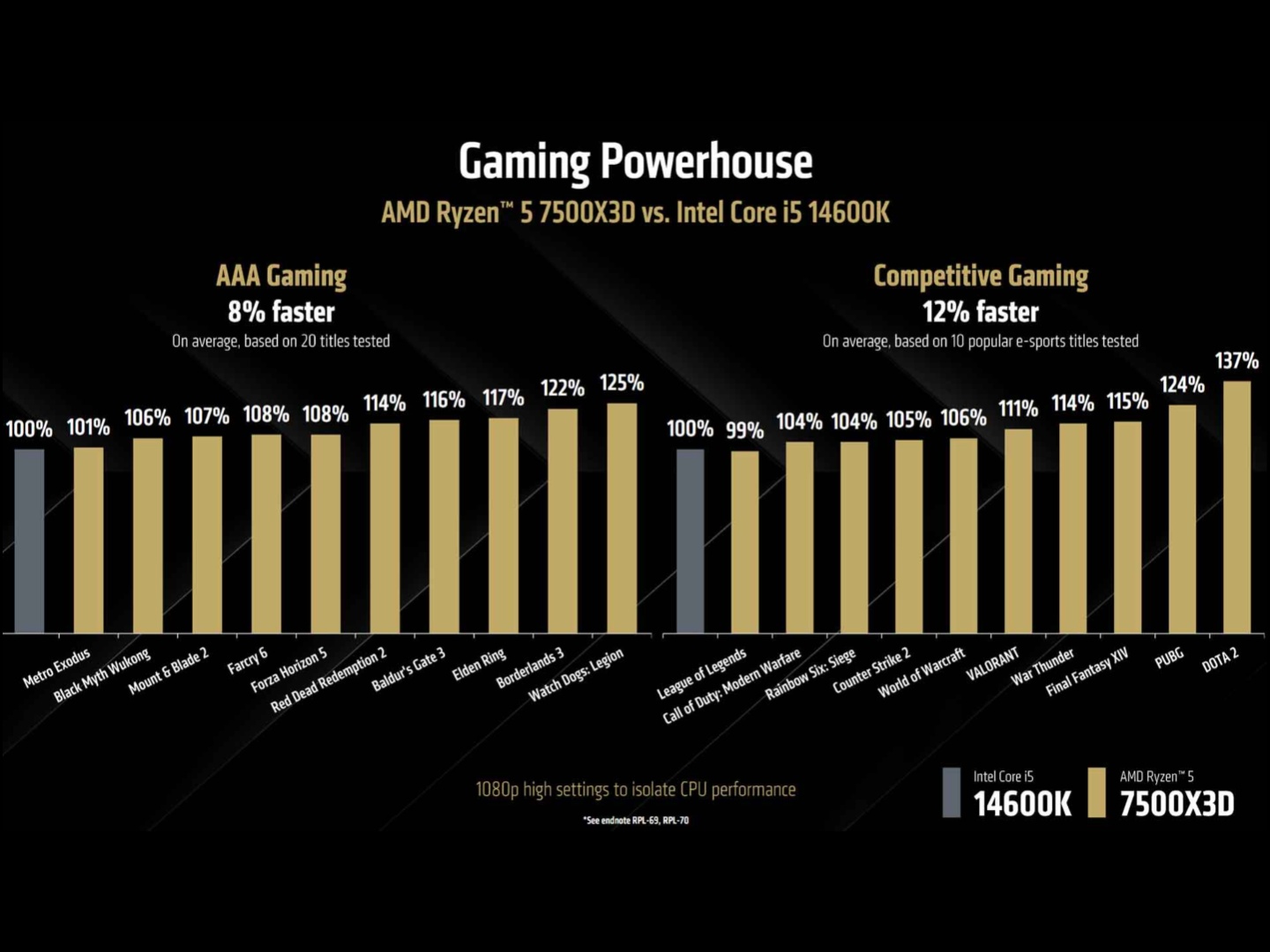 Allo stesso modo, rispetto al Core i5-14600K, AMD sostiene che Ryzen 5 7500X3D è più veloce dell'8% nei giochi AAA e del 12% nei giochi competitivi.