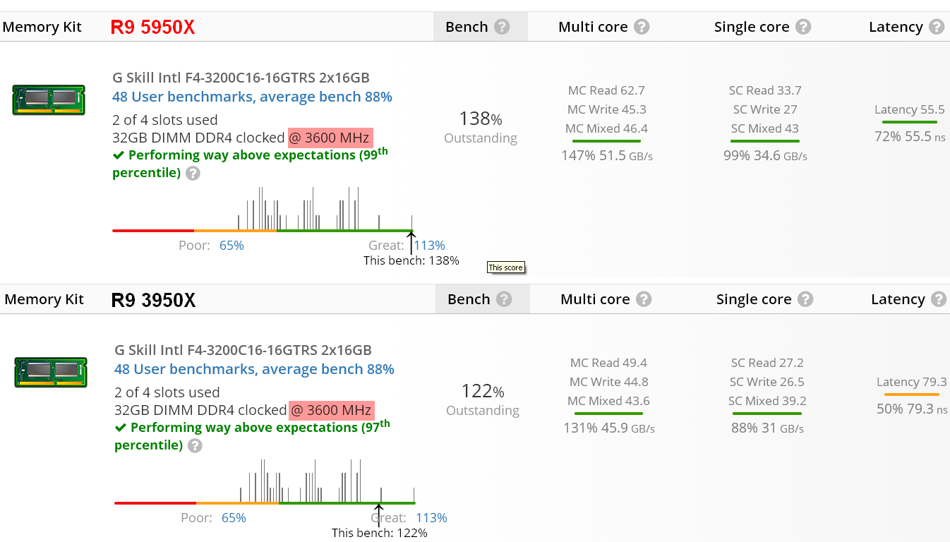 @TUM_APISAK ha condiviso un'altra voce UserBenchmark in cui il Ryzen 9 5950X ha ottenuto un punteggio del 138% rispetto al 122% del Ryzen 9 3950X nel benchmark di memoria quando testato con gli stessi moduli RAM DDR4-3600 G.SKILL CL16.