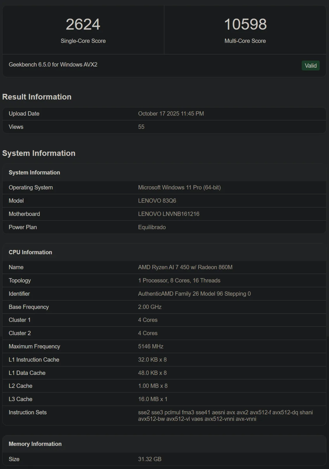 Sfortunatamente, il Ryzen AI 7 450 non fa megliocon punteggi single e multi-core di 2.624 e 10.598, rispettivamente. Al contrario, il Ryzen AI 7 350 si attesta su una media di 2.853 e 13.092. È stato presentato accanto allo stesso computer portatile Lenovo menzionato sopra con 32 GB di memoria di sistema. Dal punto di vista delle specifiche, il computer presenta il layout 4+4, con il cluster Zen 5 che raggiunge i 5,14 GHz.
