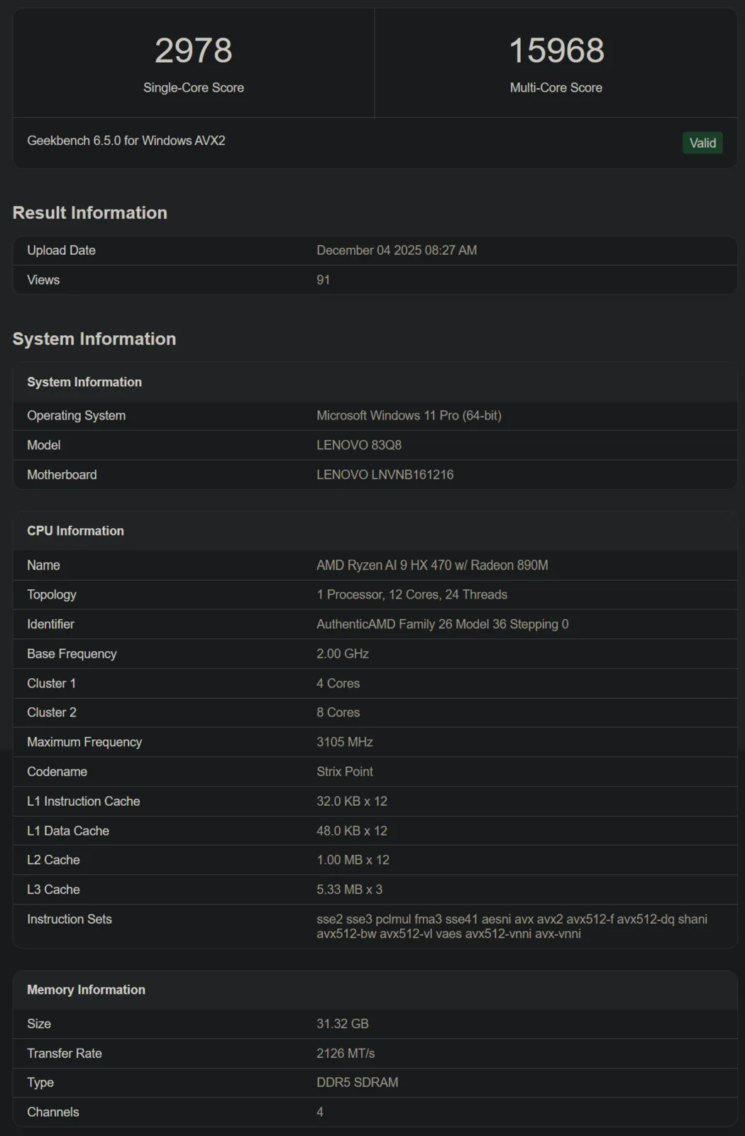 Partendo dall'ammiraglia Ryzen AI 9 HX 470, ottiene un punteggio di 2.978 e 15.968 nei test single e multi-core di Geekbench test single e multi-core di Geekbench. Si tratta più o meno dello stesso punteggio del Ryzen AI 9 HX 370 (2.890/15.051), ma non è indicativo delle prestazioni della CPU Gorgon Point, perché non raggiunge costantemente la velocità massima (5,3 GHz). È stato testato insieme a un laptop Lenovo non ancora rilasciato con 32 GB di RAM DDR5-2126, il che probabilmente influisce sul risultato complessivo di Geekbench.