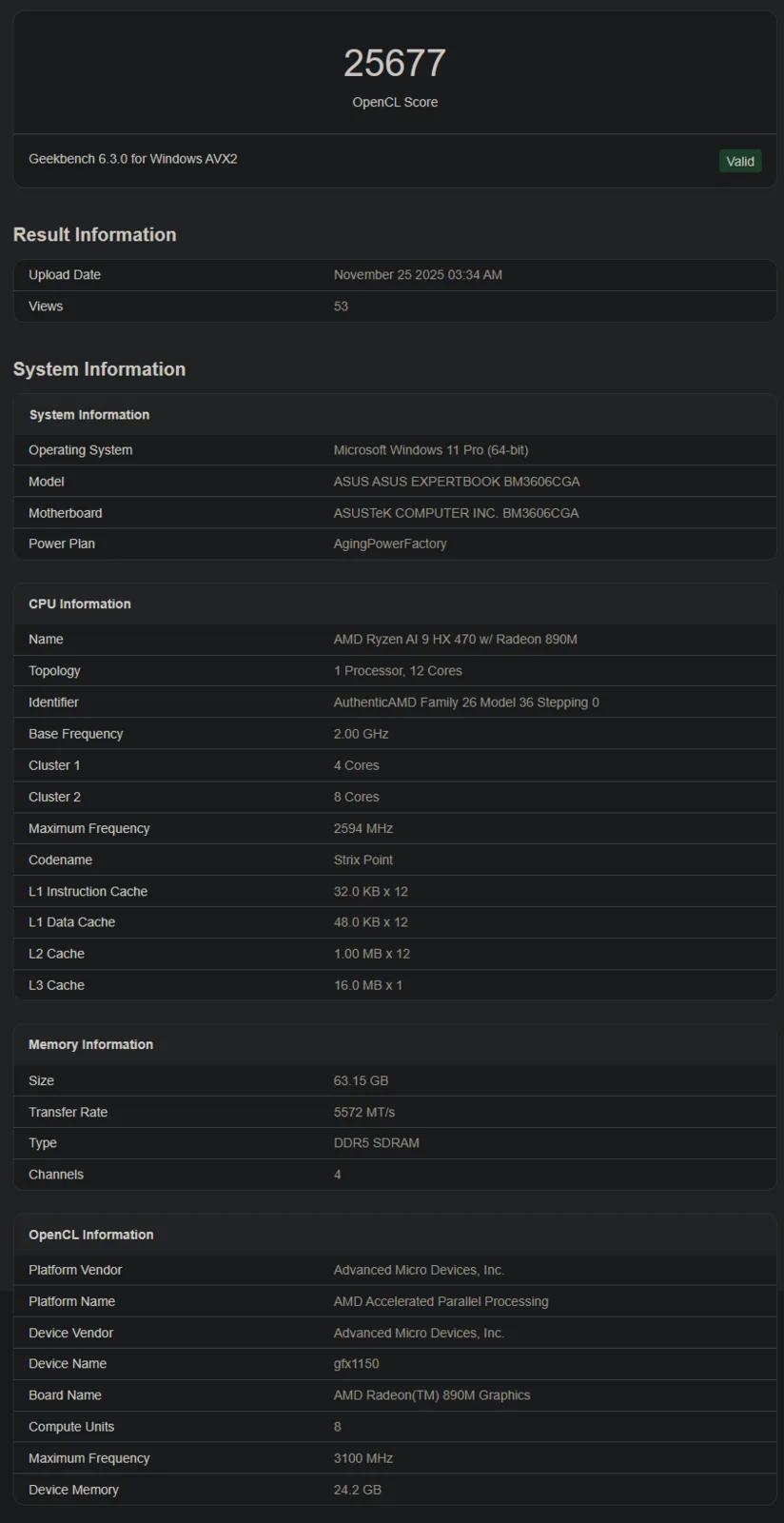 Possiamo anche dare un'occhiata alla Radeon 890M di Ryzen AI 9 HX 470 Radeon 890M iGPU di Ryzen AI 9 HX 470. Ottiene un punteggio di 25.677 nel benchmark OpenCL di Geekbench. Ancora una volta, non riesce a superare la stessa GPU della sua controparte Strix Point (39.622), nonostante un boost clock marginalmente superiore (3,1 GHz contro 2,9 GHz). Questo campione di Radeon 890M è stato presentato insieme a un laptop Asus con 64 GB di memoria DDR5-5572.