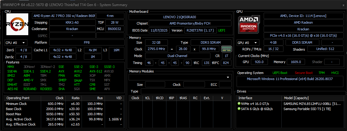 | Lenovo ThinkPad T14 Gen 6 AMD AMD Ryzen AI 7 PRO 350 ⎘ AMD Radeon 860M ⎘ 32 GB Memoria, 512 GB SSD | Amazon: Prezzo di listino: 1800 Euro | 1.4 kg | 22.1 mm | 14.00" 1920x1200 162 PPI | |