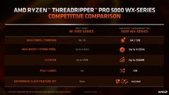 AMD presenta il Ryzen Threadripper Pro 5000 WX come il "processore workstation definitivo" con fino a 64 core Zen 3, 128 corsie PCIe Gen 4 e otto canali di memoria. Queste CPU HEDT presentano anche diverse caratteristiche di sicurezza e gestibilità AMD Pro sostenute da 18 mesi di disponibilità software pianificata e 24 mesi di disponibilità hardware pianificata.