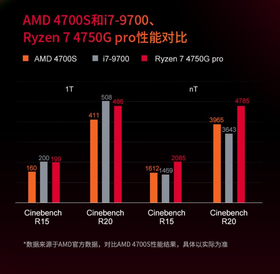 Poiché l'iGPU non è abilitata in questa particolare APU, l'AMD 4700S può raggiungere una frequenza di clock della CPU più alta rispetto alla Xbox Series X (4.0 GHz contro un massimo di 3.8 GHz). Senza una parte iGPU funzionante in questo particolare sistema Mini-ITX basato su AMD 4700S, la presenza di una dGPU è quindi richiesta per essere classificato come un computer da gioco serio. Sfortunatamente, questa è fornita dalla Radeon RX 550 (modello 2 GB VRAM) che è basata sulla datata architettura Polaris. È interessante notare che il venditore offre un confronto di benchmark del sistema AMD 4700S contro un computer con un Intel Core i7-9750H CPU e GeForce RTX 2060 GPU. Il possibile chip ex-Xbox batte facilmente il concorrente Coffee Lake in Cinebench R15 e R20 (vedi immagini sotto), e regge bene anche in un ulteriore confronto contro un Intel Core i7-9700 e AMD Ryzen 7 PRO 4750G