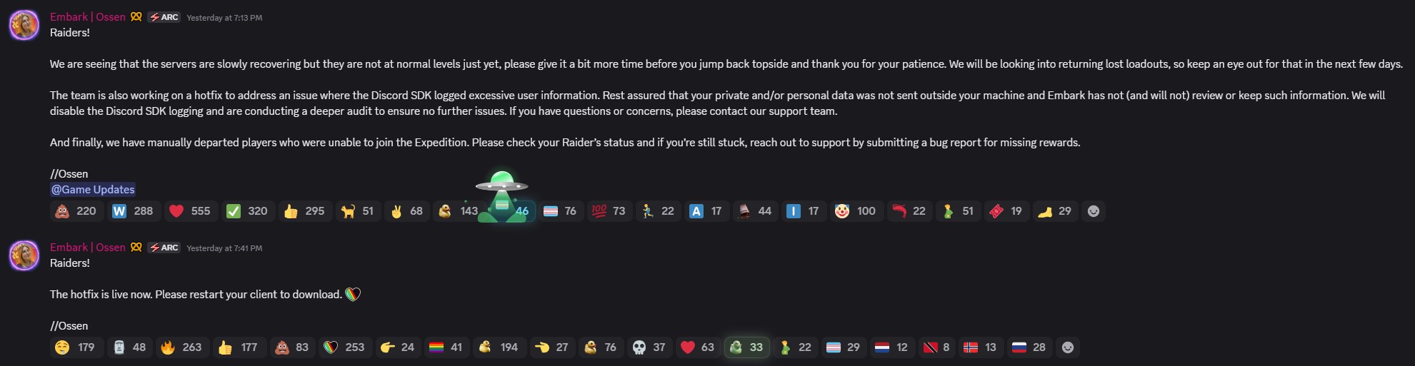 Poco dopo che il problema è diventato pubblico, Embark Studios ha risposto e ha confermato che l'SDK Discord aveva registrato più informazioni sugli utenti di quanto previsto. Lo studio ha assicurato ai giocatori che i dati non sono mai stati trasmessi al di fuori del computer dell'utente e che gli sviluppatori non hanno mai avuto accesso o memorizzato i messaggi stessi. È stato inoltre rilasciato un hotfix che disabilita il comportamento problematico di registrazione. Il team ha inoltre dichiarato che sta eseguendo un controllo più approfondito per assicurarsi che problemi simili non si presentino in futuro.