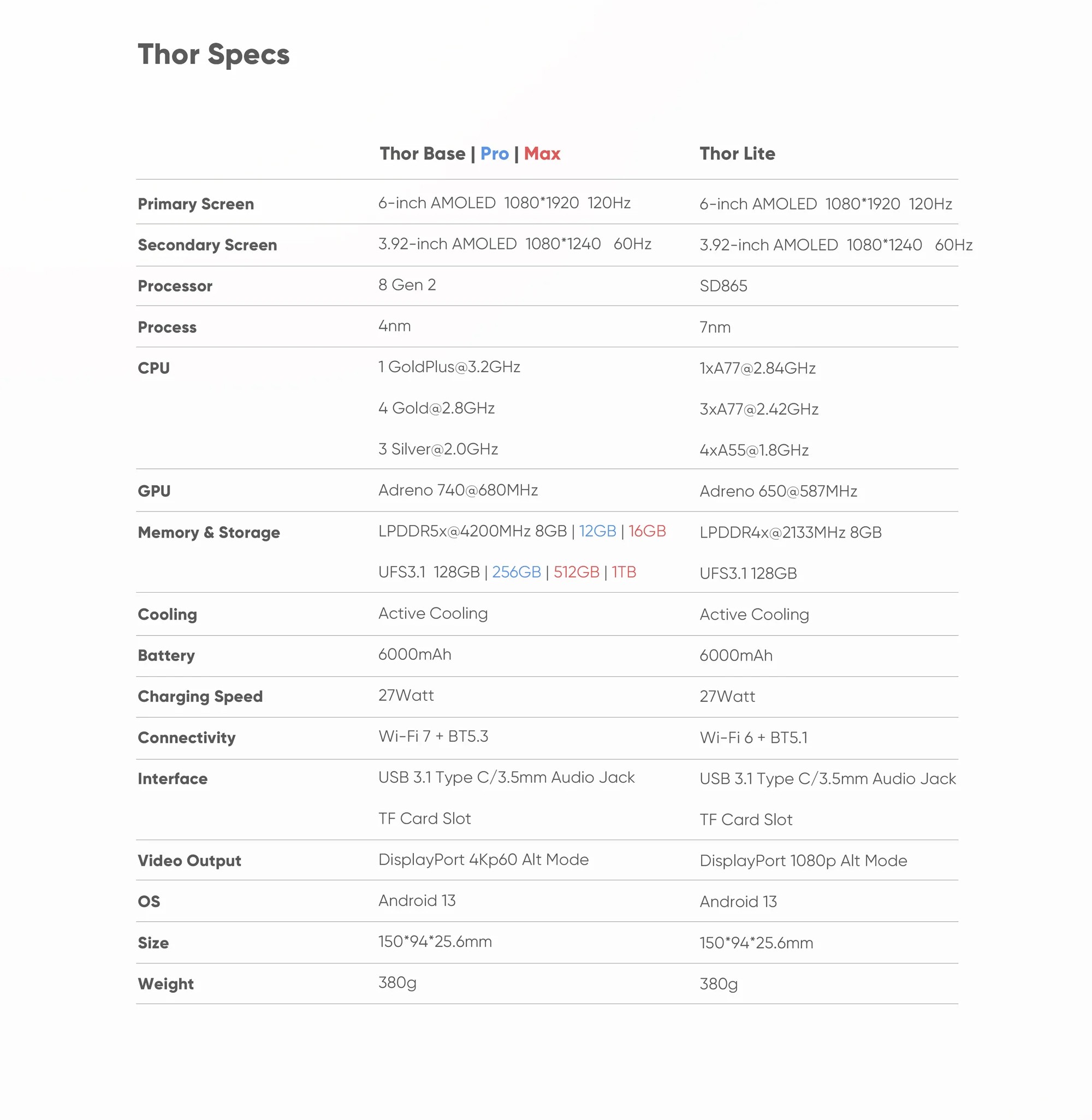 Il cambiamento del tipo di archiviazione influisce sul Snapdragon 8 Gen 2-del Thor. Questo include il Thor Base con 8 GB di RAM e 128 GB di memoria, il Thor Pro con 12 GB di RAM e 256 GB di memoria e il Thor Max con 16 GB di RAM e 512 GB di memoria. Il Thor Lite, che ha un Processore Snapdragon 865 utilizza già lo storage UFS 3.1 e continuerà a farlo.