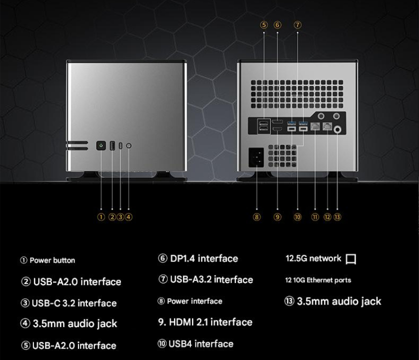 Come mostra l'immagine qui sotto, Abee AI Station dispone di numerose porte sui pannelli anteriore e posteriore. Inoltre, il mini-PC contiene un alimentatore (PSU) da 400 W integrato. Tuttavia, Abee sostiene che AI Station misura solo 199 x 199 x 199 mm. Tuttavia, il guscio interamente in alluminio contribuisce al peso ufficiale di 5,3 kg del dispositivo.