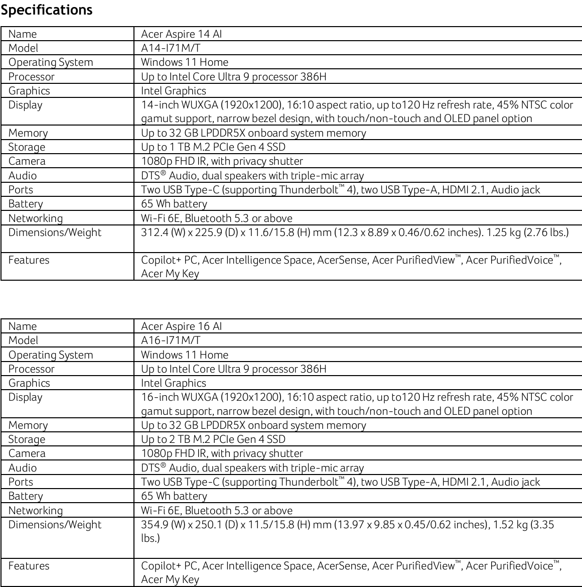 Aspire 14 AI e Aspire 16 AI sono PC Copilot+ alimentati dal processore Intel Core Ultra 9 386H con fino a 32 GB di RAM LPDDR5x e fino a 2 TB di SSD M.2 NVMe.