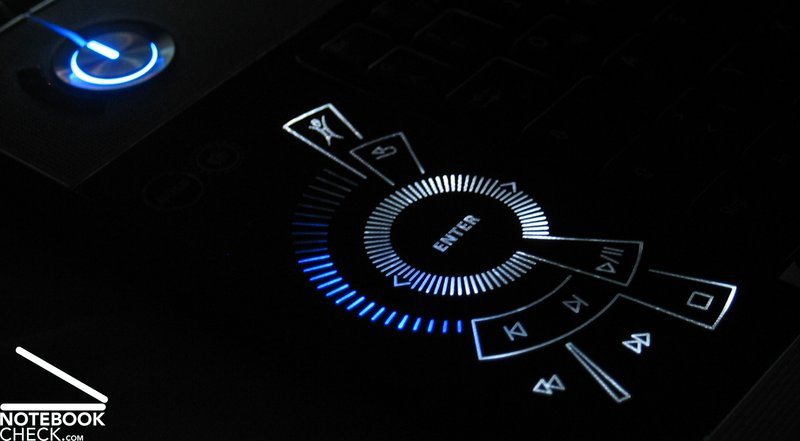 Il notebook ha delle features luminose, una di queste è la CineDash Media Console . Si tratta di un pannello sensibile che controlla le funzioni multimedia e si trova sul lato sinistro della tastiera. Anche il pulsante di accensione emette una luce blu, è si trova in cima alla tastiera. La sua luminosità ed il design attirano l'attenzione. Anche il logo evidenziato sulla copertura appare buono e da una buona impressione con il suo effetto 3D.