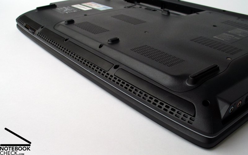 Sul lato sinistro del case c'è l'alimentazione, vicino alla cerniera. E le porte modem e LAN. Inoltre, ci sono un connettore VGA analogico e una porta HDMI completamente digitale. In aggiunta, ci sono due porte USB 2.0 ed alcuni connettori audio. Le porte audio riguardano le cuffie, il microfono, un ingresso ed una porta ottica S/PDIF che offre suono sorround 5.1.
