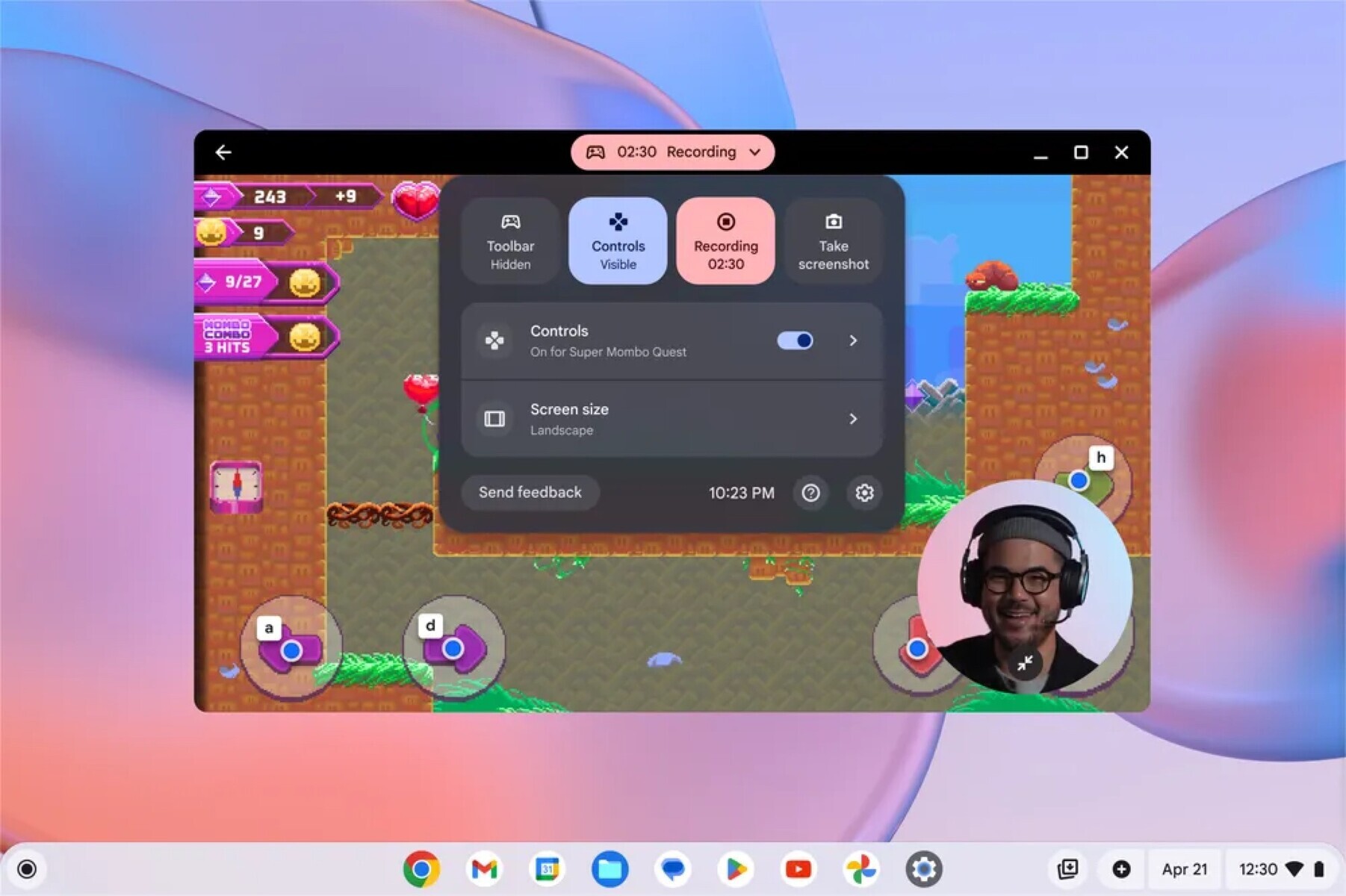 A tal fine, l'introduzione di Chromebook Plus 516 GE coincide con l'annuncio di una nuova Game Dashboard per ChromeOS, che si può vedere nell'immagine sottostante. In breve, la Game Dashboard offre un accesso rapido a varie funzioni di gioco, compresa la possibilità di avviare una registrazione dello schermo. Consulti il post sul blog di Google per informazioni al riguardo.