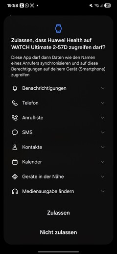Nei test, lo smartwatch è stato rilevato immediatamente e accoppiato senza problemi. Durante la configurazione è necessario concedere diverse autorizzazioni. È richiesto anche un ID Huawei. Al termine del processo, viene lanciato un tutorial sull'orologio. Una cosa salta all'occhio: ogni app aperta sullo smartwatch richiede un consenso separato per l'elaborazione dei dati.