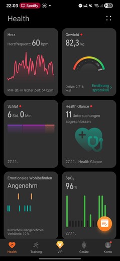 L'app Salute è suddivisa in cinque sezioni: Salute, Allenamento, VIP, Dispositivi e Account. La scheda Salute funge da cruscotto per tutti i dati biometrici registrati, visualizzati sotto forma di piastrelle personalizzabili.