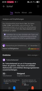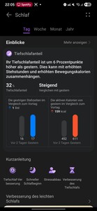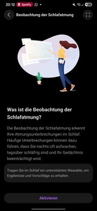 L'orologio traccia anche la continuità del sonno profondo, la qualità della respirazione, la frequenza cardiaca, la saturazione di ossigeno e la frequenza respiratoria. Il rilevamento dei suoni del sonno richiede uno smartphone abbinato nelle vicinanze. Il sonno complessivo viene valutato con un punteggio e un sistema di stelle, e il software fornisce analisi e raccomandazioni per migliorare la qualità del sonno.