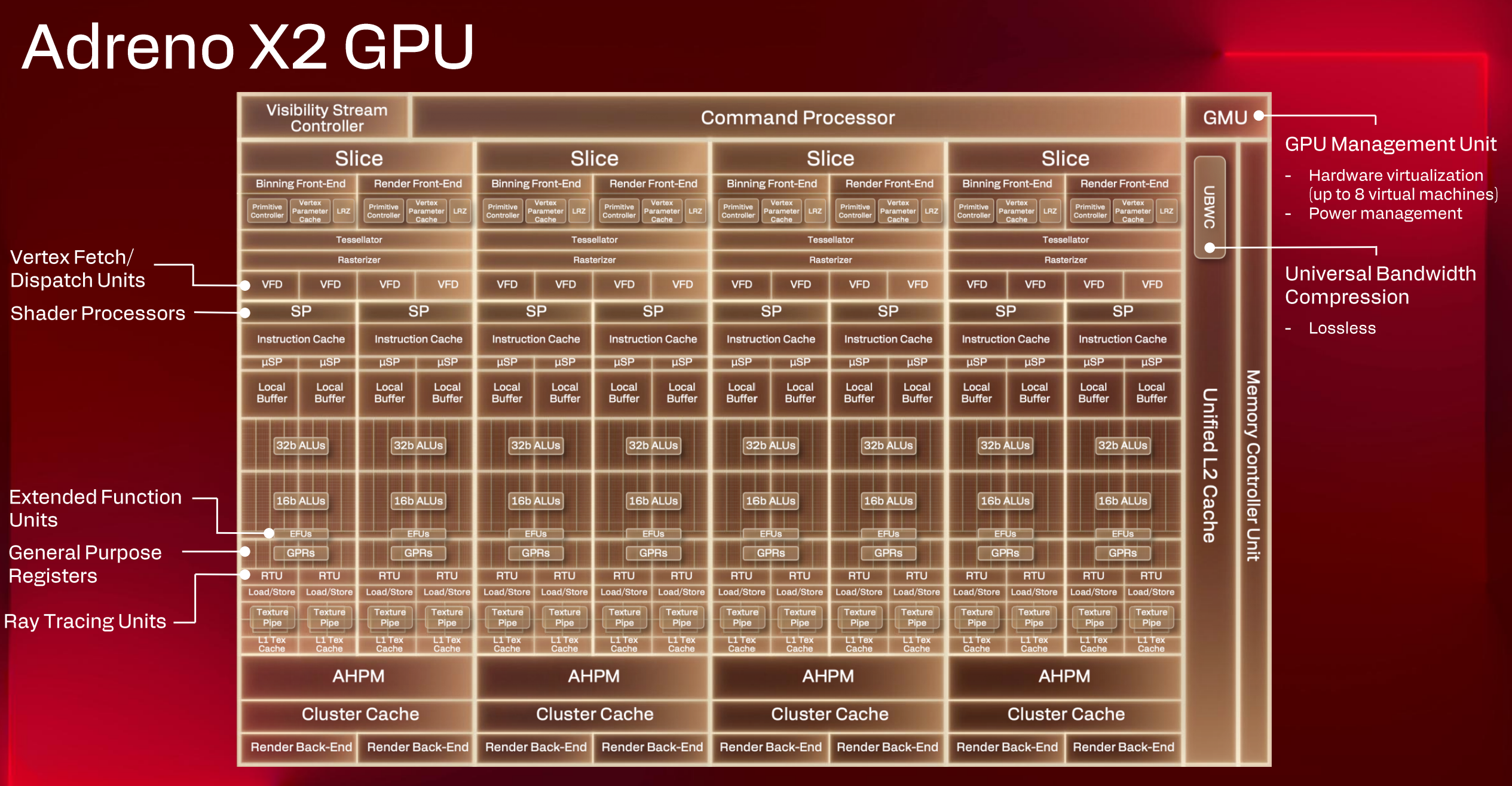 L'Adreno X2 raggiunge questo obiettivo con 21 MB di quella che Qualcomm chiama 'memoria on-chip ad alte prestazioni'. Si tratta essenzialmente di un blocco di cache L3 accessibile da tutte le fette di rendering (5,25 MB/ fetta). Qualcomm sostiene che i processori shader possono accedervi fino a 4 TB/s. Altrimenti, la GPU può accedere alla RAM LPDDR5X-9523 del SoC fino a 228 GB/s. Ogni slice di Adreno X2 ha due pipeline di texture, quattro unità di raytracing, due backend di rendering e due processori shader.