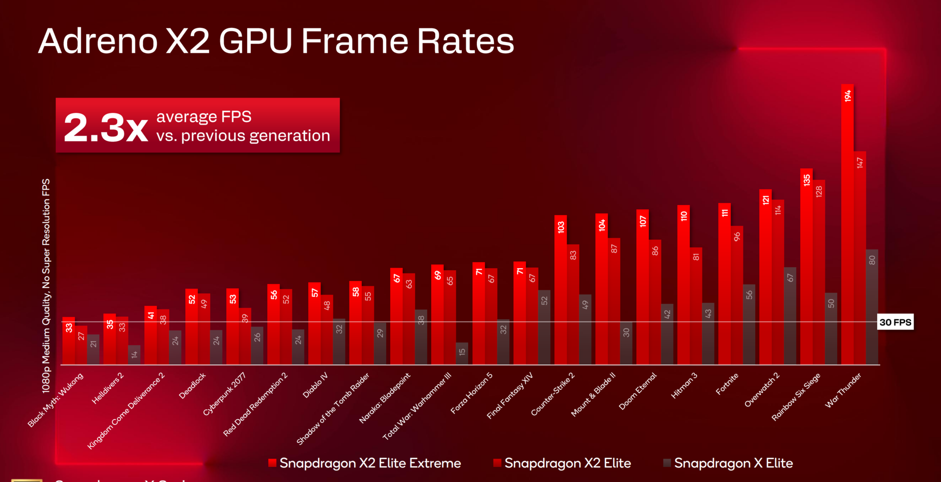 Se confrontata con le alternative di pari livello di Intel e AMD, l'Adreno X2 è sorprendentemente potente. Scambia i colpi con la Radeon 890M e Arc 140v in un'ampia gamma di titoli, come Diablo IV, Metro Exodus, The Witcher 3: Wild Hunt e, ancora una volta, War Thunder. Si tratta di benchmark di prima parte condotti su un dispositivo di riferimento Qualcomm e non su un laptop pronto per la produzione. Le differenze effettive saranno evidenti quando i laptop con Snapdragon X2 Elite saranno disponibili all'inizio del 2026.