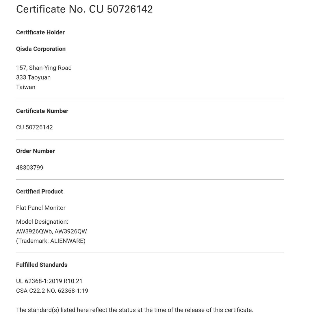 In particolare, una recente certificazione TÜV Rheinland ha rivelato che Dell ha sviluppato un nuovo monitor Alienware con il numero di modello AW3926QW. In base allo schema di denominazione di Alienware, l'AW3926QW è un monitor da 39 pollici. In questo senso, l'AW3926QW sarà significativamente più grande del modello AW3425DWche Dell ha lanciato a livello globale poco più di un anno fa.
