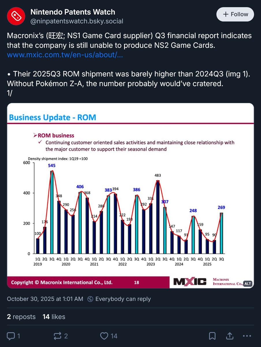 Osservatorio sui brevetti Nintendo su Bluesky ha discusso il rapporto finanziario trimestrale rilasciato dall'azienda taiwanese. Il presidente di Macronix ha citato i ritardi nella ricerca e nello sviluppo, che hanno avuto un impatto sui piani per lo Switch 2. Tuttavia, il produttore ha una prospettiva più ottimistica per il "business ROM" nel 2026.