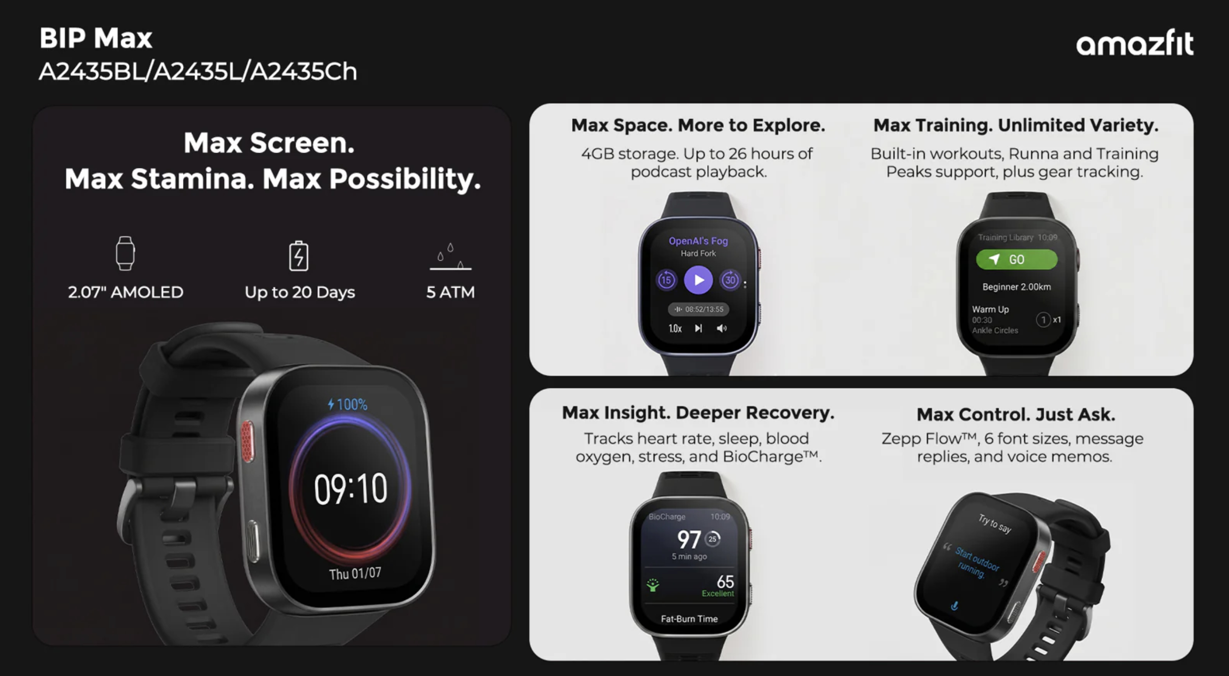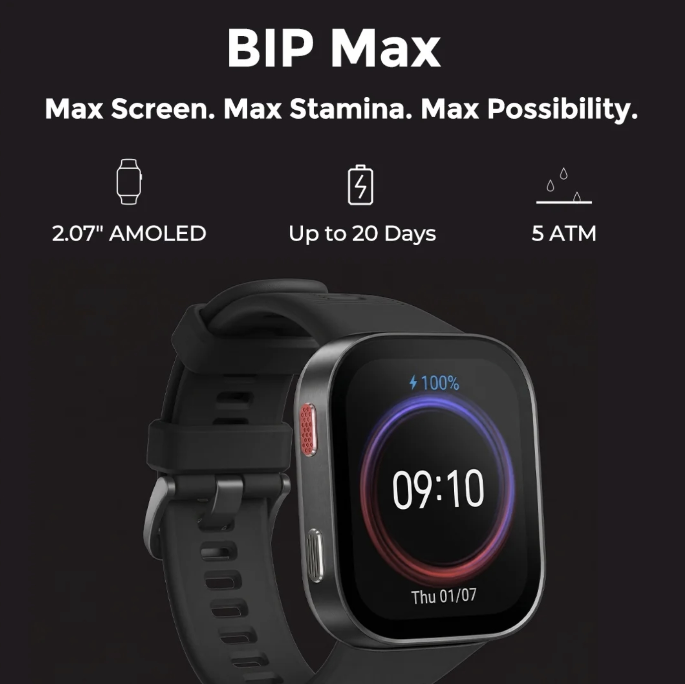 In base a queste immagini trapelate, il Bip Max corrisponderà al Cheetah 2 Pro con un display AMOLED da 3.000 nit e una durata della batteria fino a 20 giorni. Anche se il Bip Max passa a un display da 2,07 pollici, si trova all'interno di una cassa più piccola di 2 mm rispetto al Cheetah 2 Pro. Amazfit ha incluso 4 GB di memoria nel suo nuovo smartwatch da 46 mm, rispetto ai 32 GB del Cheetah 2 Pro.