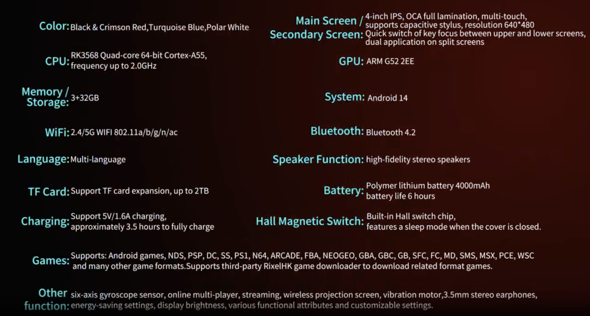 Oltre a ciò, l'annuncio riporta che l'RG DS funziona con Android 14 con connettività Bluetooth e Wi-Fi, ma ad un prezzo iniziale di 108,99 dollari che alla fine raggiungerà i 114,99 dollari. Le offerte di lancio potrebbero però far scendere l'RG DS sotto i 100 dollari, come indicato in precedenza.