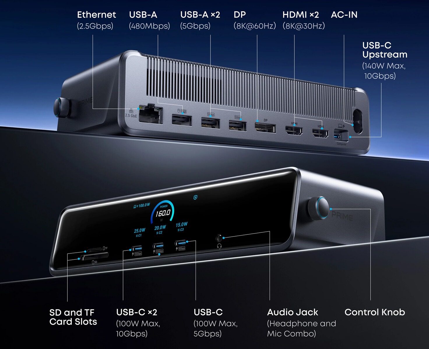 C'è il supporto per il controllo dell'app https://www.anker.com/blogs/hubs-and-docks/a83b3che consente agli utenti di monitorare tutti i dispositivi collegati, di modificare le impostazioni del casting del display e di eseguire la diagnostica. La Prime Docking Station 14-in-1 è dotata anche di un display intelligente integrato, che mostra le informazioni in tempo reale sulle porte.