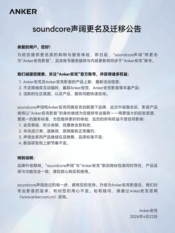 Anker aggiunge che, durante la transizione al nuovo marchio, saranno disponibili sul mercato prodotti con il marchio Soundcore o Anker, quindi gli acquirenti non devono preoccuparsi di un cambiamento di qualità o di una differenza di funzione, poiché entrambi i prodotti sono uguali.