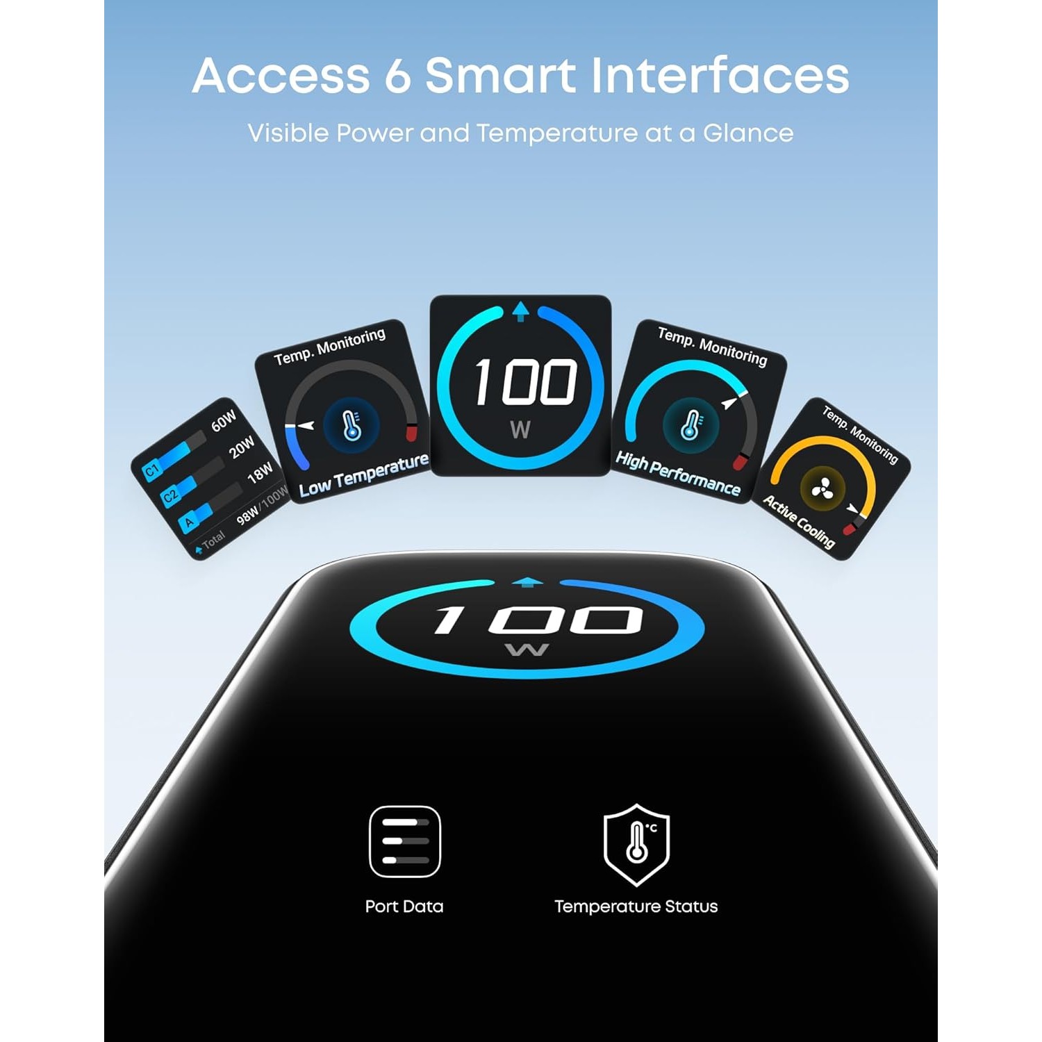 Quando si ricarica un singolo dispositivo, entrambe le porte USB-C possono erogare l'intera potenza di 100W. La potenza viene suddivisa in 70W e 30W, 67W e 33W o 95W e 5W quando sono collegati due dispositivi, e in 80W, 12W e 7,5W quando sono in uso tutte e tre le porte. In ogni caso, gli utenti ottengono una potenza sufficiente per alimentare un computer portatile e altri dispositivi allo stesso tempo. Inoltre, il caricatore include una modalità automatica a basso consumo che limita l'uscita USB-A a 5W per i dispositivi a basso consumo come gli auricolari.