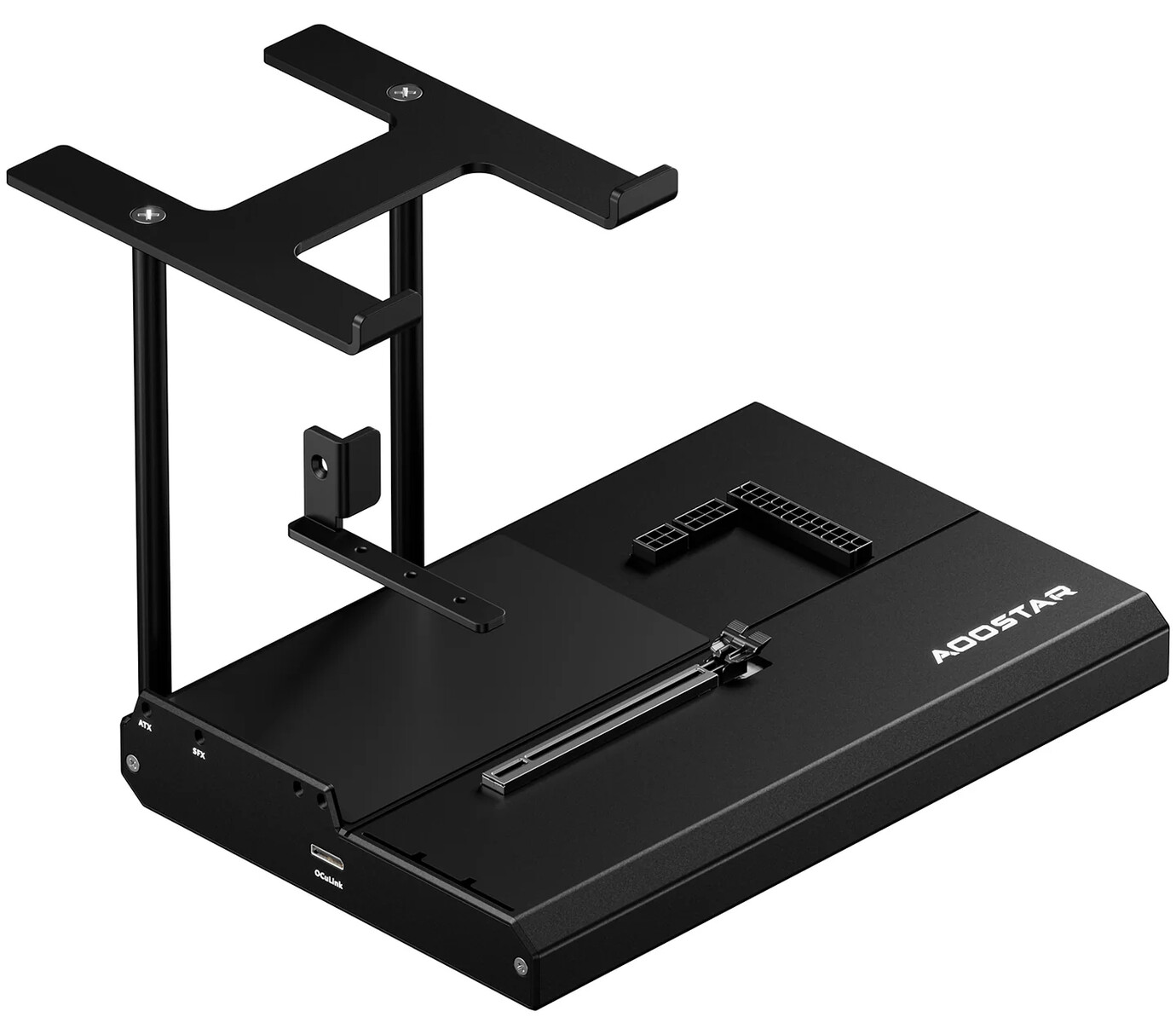 Apparentemente, l'EG01 assomiglia ad un Minisforum DEG1 ma con un supporto per riporre un mini-PC. Come mostra l'immagine sottostante, questo supporto è staccabile ma deve essere avvitato tramite tre viti che si fissano sotto la piastra inferiore dell'EG01. In altre parole, questa soluzione di montaggio è leggermente più permanente rispetto alla staffa per GPU che si attacca a una PSU ATX o SFX.