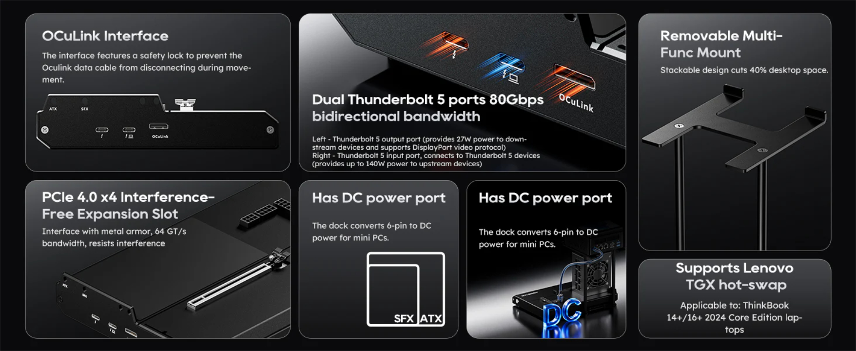 A prima vista, Aoostar EG02 è la copia sputata dell'EG01. Per prima cosa, il primo conserva il sistema di montaggio e il connettore di alimentazione DC del secondo. Allo stesso modo, mantiene il fattore di forma inaugurato dal modello Minisforum DEG1 e da Link S-1 o Link S-2 di Peladn Link S-2. Tuttavia, Aoostar EG02 adotta la connettività OCuLink e Thunderbolt 5, anche se, come il modello Minisforum DEG2 e Peladn Link S-3 prima di lui.