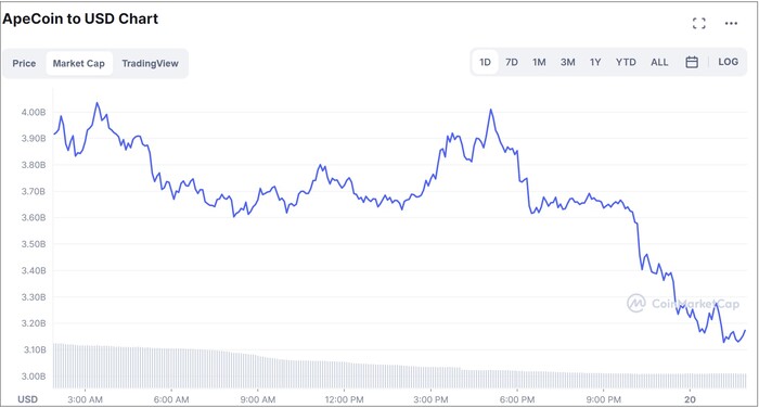 Tuttavia, non sorprende che ci sia stato un considerevole sell-off dell'ultima moneta meme a quel massimo di 17,75 dollari, mandando il prezzo giù ad un ancora attraente 15 dollari come probabile fortunato airdrop destinatari hanno deciso di incassare. Da allora, ApeCoin ha flirtato con i 14 e i 13 dollari, prima di fare un bel tuffo a 11,33 dollari (e stava ancora scendendo al momento della scrittura). Questo ha lasciato ApeCoin con un enorme mal di testa legato al market cap, poiché il suo valore complessivo è stato massacrato da 4,04 miliardi di dollari ad un minimo di 2,84 miliardi di dollari.