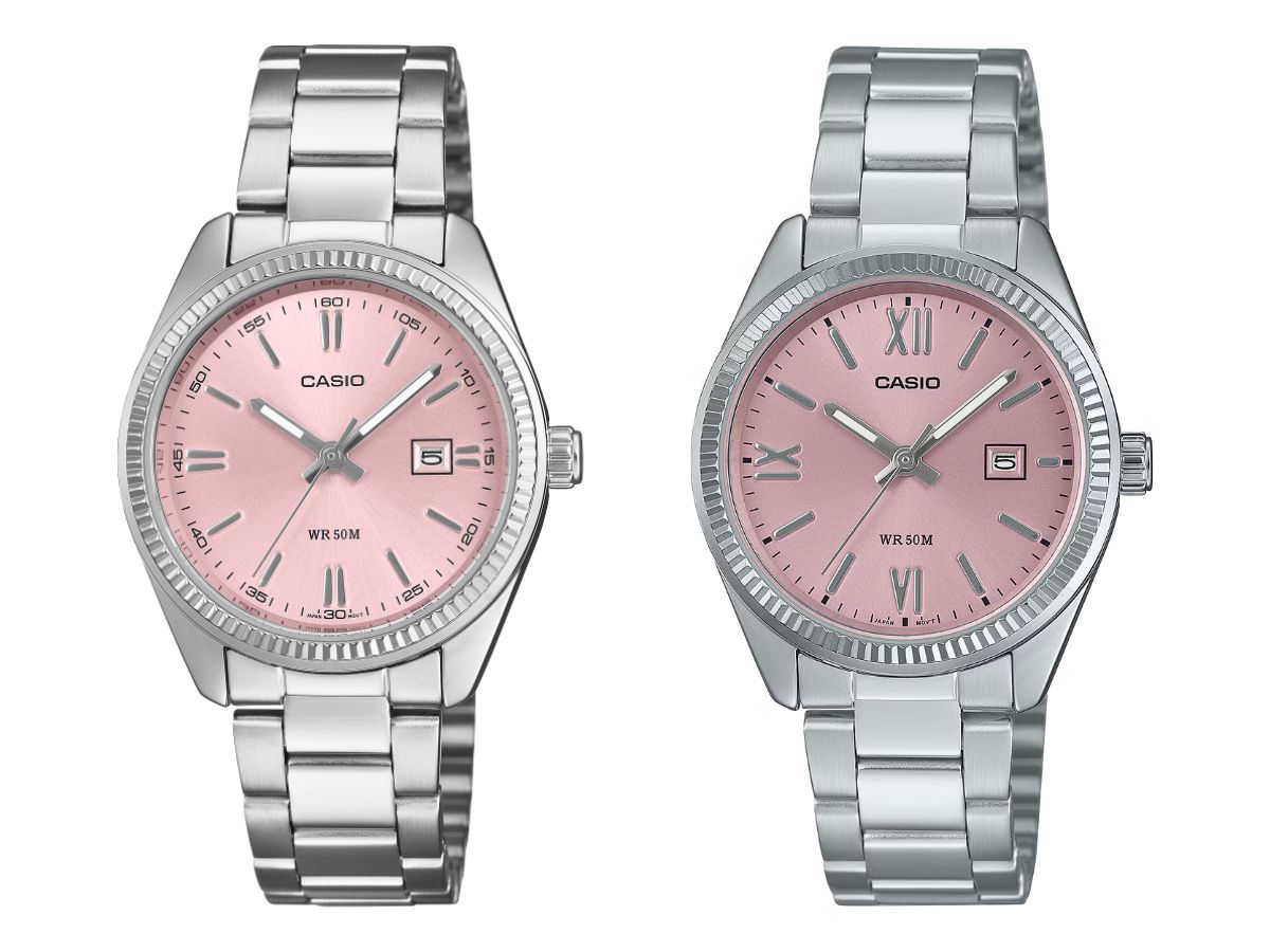 Il nuovo LTP-1302PD-4AV di Casio ha un quadrante sunray rosa pastello con indici e lancette color argento. Queste si abbinano alla cassa cromata argentata circostante, che misura 34,5 x 30,2 x 8,7 mm (~1,36 x 1,19 x 0,34 pollici). Questo modello ha anche un bracciale in acciaio inossidabile e una lunetta scanalata.