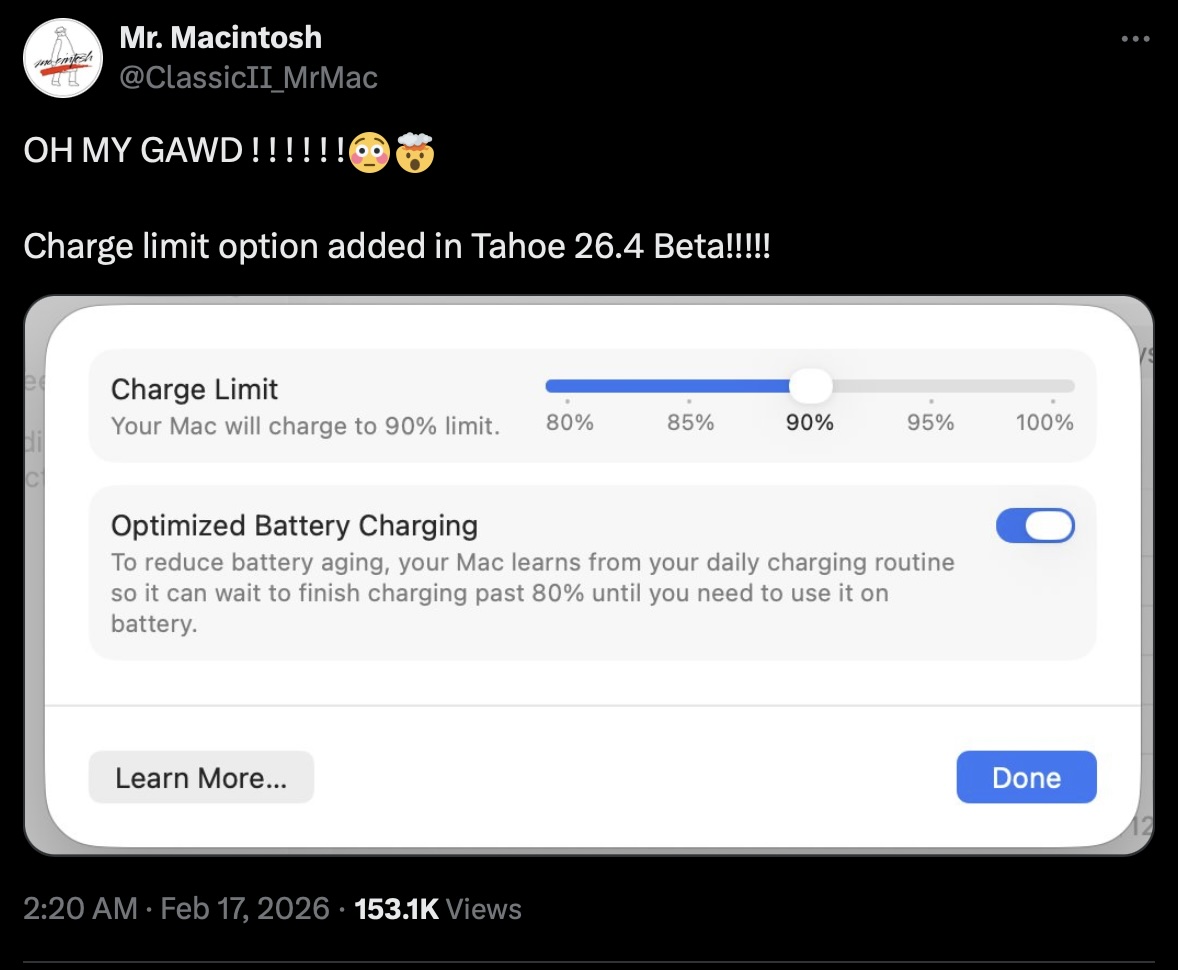 Con l'ultimo macOS Tahoe 26.4 BetaApple sembra aver scavato la fossa ad applicazioni come AlDente. Per la prima volta, gli utenti di MacBook possono imporre limiti di carica all'interno dell'app Impostazioni di sistema, anche se il valore più basso possibile è bloccato all'80%. Coloro che desiderano numeri ancora più bassi, per qualsiasi motivo, dovranno comunque optare per soluzioni di terze parti.
