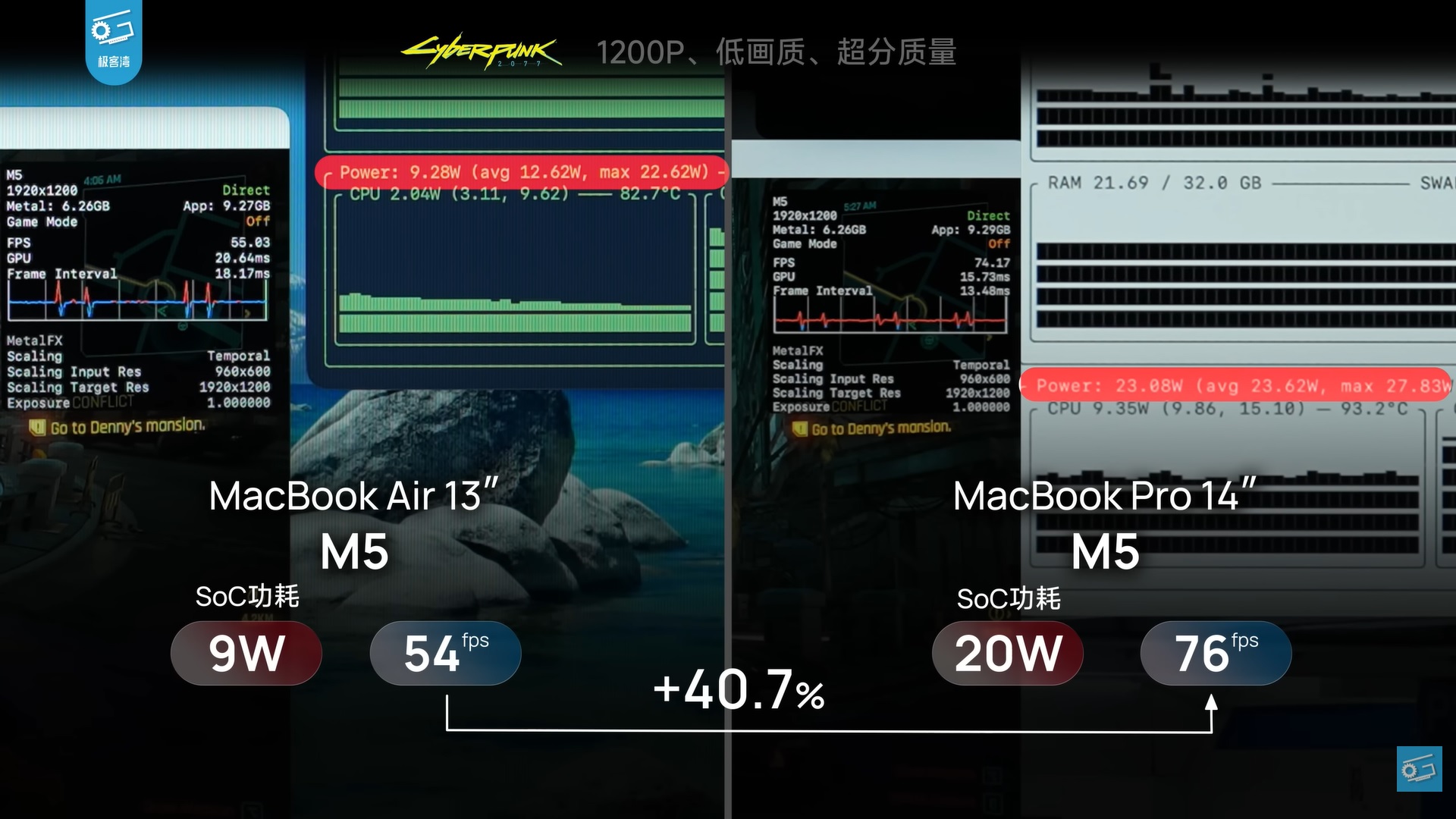 Il recensore tecnologico coreano Geekerwan riferisce che, in Cyberpunk 2077 a 1200p/basso con upsampling MetalFx, il MacBook Air 13 M5 ha consumato solo 9 W e ha gestito 54 FPS. Tuttavia, il MacBook Pro 14 M5 ha eseguito il gioco a 76 FPS con un consumo di 20 W. Si tratta di un'enorme differenza di prestazioni del 40,7% tra i due portatili.