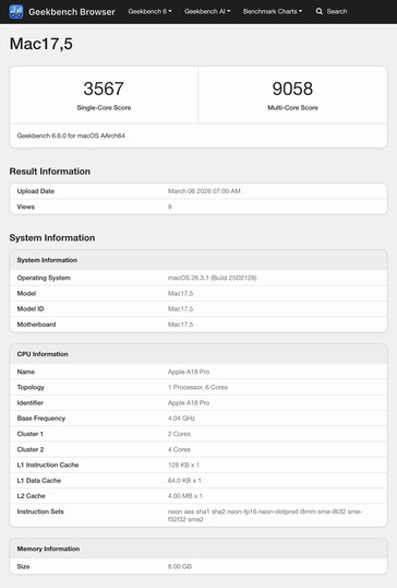 Allo stesso modo, le prestazioni della CPU multi-core indicano che il MacBook Neo è marginalmente più potente del MacBook Air M1. D'altra parte, una media single-core di 3.530 è superiore di quasi il 50% rispetto allo stesso MacBook con 2.363 punti. Spedizione, Apple M2-i MacBook alimentati, il A18 Pro aiuta il MacBook Neo a ottenere un punteggio superiore di circa il 12,7% rispetto anche al MacBook Pro 14 M3 raffreddato attivamente MacBook Pro 14 M3 raffreddato attivamente. In effetti, il MacBook Neo è appena dietro ai dispositivi della generazione Apple M4 nei carichi di lavoro single-core. Consulti il nostro articolo sul lancio del MacBook Neo per maggiori dettagli su Apple's MacBook da 599 dollari.