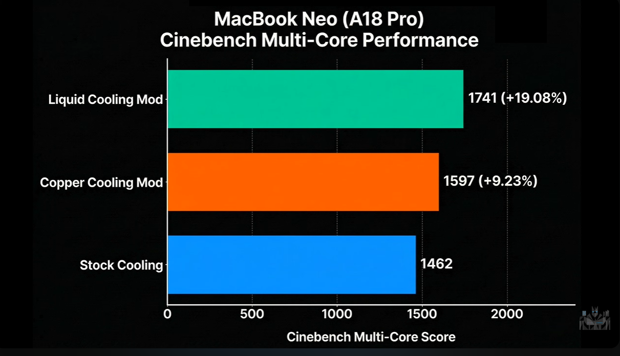 ETA Prime ha anche testato un raffreddatore ad acqua termoelettrico per vedere quanto il MacBook Neo possa migliorare le sue prestazioni. Il dissipatore termoelettrico ha fatto scendere la temperatura di esercizio di Apple A18 Pro a metà dei 70 C in No Man's Sky, con FPS appena inferiori a 60. In Geekbench 6.6, il MacBook Neo ha funzionato ancora più velocemente, con un aumento totale delle prestazioni single-core e multi-core rispettivamente del 17,5% e del 18,6%.