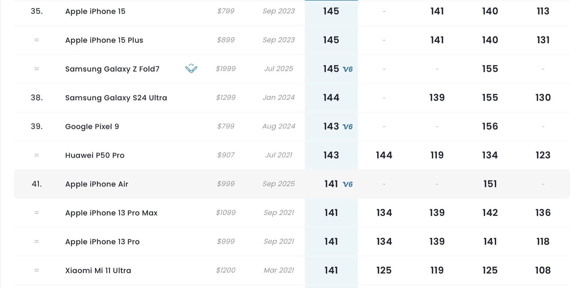 Il Motorola Edge 70 dimostra che non è necessario che sia così, poiché racchiude tre fotocamere posteriori in un involucro di 5,99 millimetri. Nell'analisi dettagliata delle fotocamere di DxOMark dxOMark, la mancanza di fotocamere dedicate si traduce, senza sorpresa, in una drastica detrazione di punti, in quanto lo zoom digitale e le modalità panoramiche non possono sostituire una fotocamera ultra-grandangolare e un teleobiettivo dedicati. Con un punteggio di 141 punti, l'iPhone Air si posiziona solo al 41° posto della classifica dei migliori di https://www.dxomark.com/smartphones/dietro al Google Pixel 8, all'iPhone 15 e allo Xiaomi 15