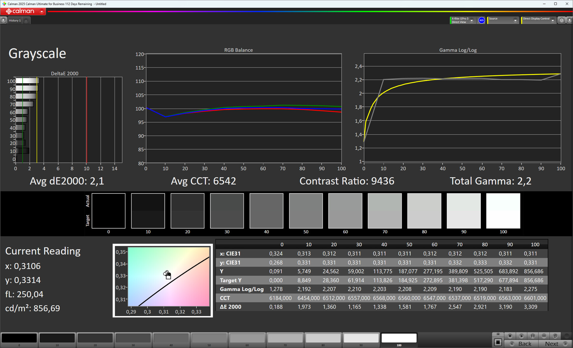L'immagine di ColorChecker era molto buona, con nessun colore che superava un DeltaE di 10. La deviazione più alta (dE 9,9) è il ciano, che è eccessivamente luminoso.