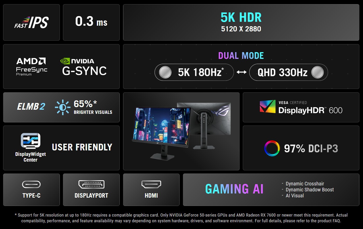 Anche alla risoluzione nativa di 5K, l'XG27JCG può raggiungere una frequenza di aggiornamento di 180 Hz. Inutile dire che gli utenti avranno bisogno di una GPU abbastanza potente per raggiungere questo limite. Asus raccomanda una scheda Nvidia GeForce RTX 50 o una scheda AMD Radeon RX 7600 e successive. Altre caratteristiche di gioco includono il supporto di G-Sync e FreeSync Premium, un tempo di risposta GtG di 0,3 ms e Extreme Low Motion Blur 2 (ELMB 2) per migliorare la chiarezza nei giochi veloci.