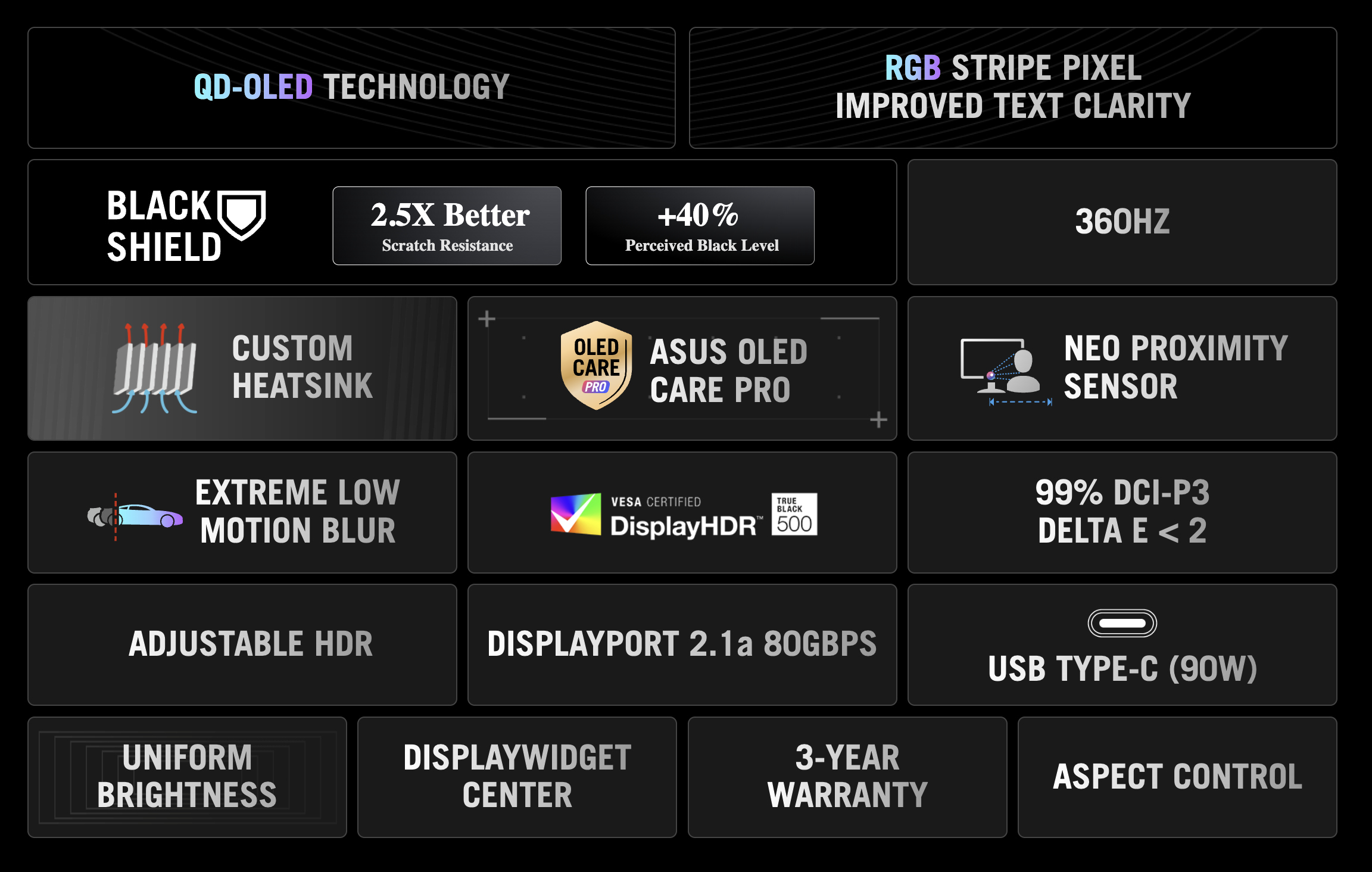 Inoltre, Asus completa questo pannello QD-OLED Gen 5 con Black Shield, un nuovo rivestimento che, secondo l'azienda, riduce i livelli di nero fino al 40% e offre una resistenza ai graffi superiore di 2,5 volte. Inoltre, ROG Swift OLED PG34WCDN produce 3.440 x 1.440 pixel su una superficie di 34 pollici e 1800R, con una frequenza di aggiornamento di 360 Hz, tempi di risposta GtG di 0,03 ms e tecnologie AMD FreeSync Premium Pro/Nvidia G-Sync VRR.