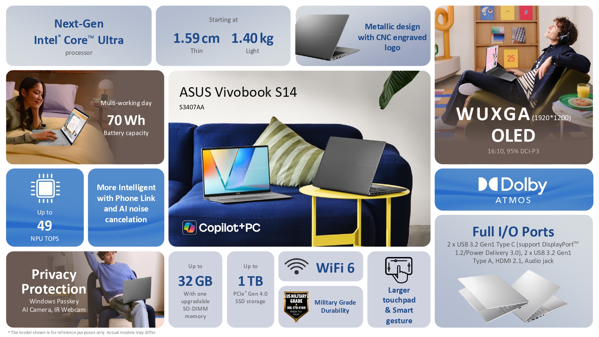 Entrambi i modelli presentano lo stesso design metallico con un logo inciso a CNC. Dal punto di vista delle dimensioni, tutte e tre le varianti sono sottili appena 1,59 cm (0,62 pollici). Tuttavia, le varianti AMD e Snapdragon sono leggermente più pesanti, con un peso di 1,70 kg (3,74 libbre). Mentre il Vivobook S14/S16 Intel pesa solo 1,40 kg (3 libbre).